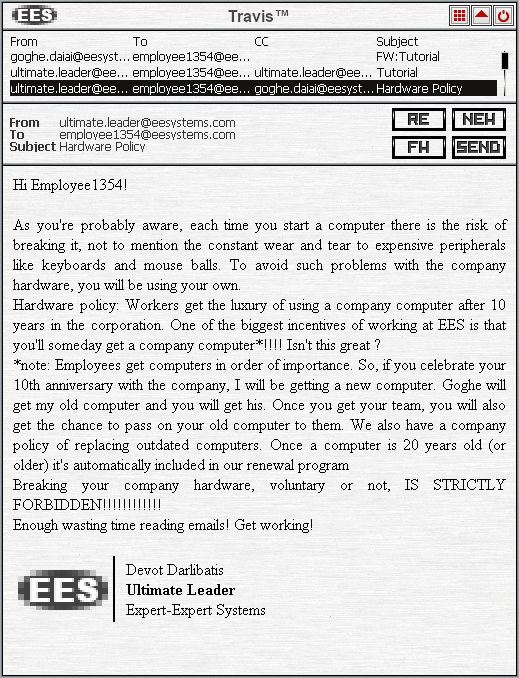 There is also a boss roaming around. One, and it's one too many. He's powerful and horrible, but only where it counts, on the inside. He's not the kind of boss which waits for you patiently in a dark cave or in a misty swamp with a big axe and the straightforward desire to do life-threatening surgery on you. Like most real life bosses, he enjoys overly bright offices and caffeine, crushing the souls of his employees, majorly disrupting the work of everyone and, on the outside, looking like a normal human being. But don't let yourself fooled by this! You'll need to fight him constantly!